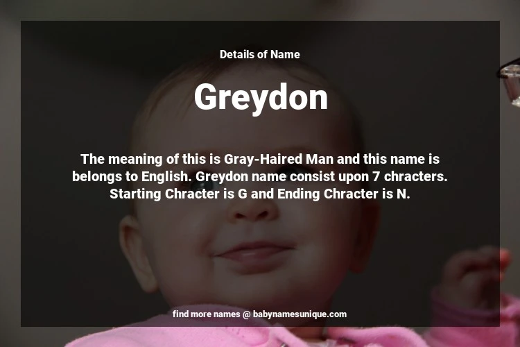 The name Greydon is chosen by those who are willing to find Unique Boy Baby Names. The meaning of this is Gray-Haired Man and this name is belongs to English Origin. Baby Name Greydon consist upon 7 chracters. Starting alphabet is G and ending alphabet is N. This name is used primarily by parents who are considering unique baby names for Boy. The Zodiac Sign suitbale for this name are;