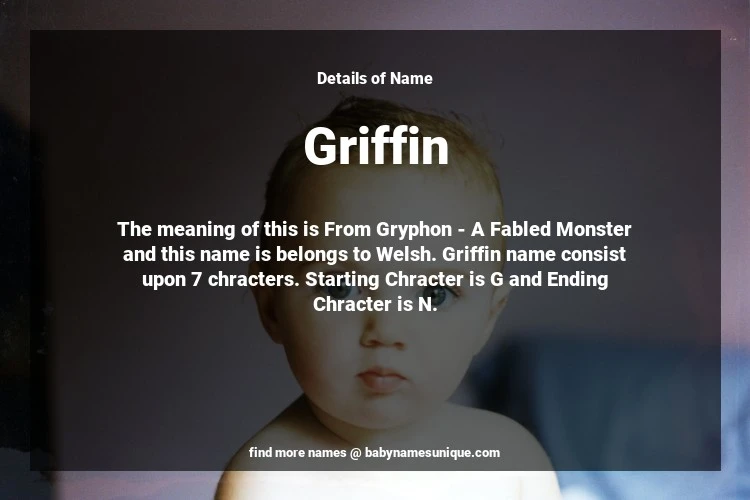 The name Griffin is chosen by those who are willing to find Unique Boy Baby Names. The meaning of this is From Gryphon - A Fabled Monster and this name is belongs to Welsh Origin. Baby Name Griffin consist upon 7 chracters. Starting alphabet is G and ending alphabet is N. This name is used primarily by parents who are considering unique baby names for Boy. The Zodiac Sign suitbale for this name are;