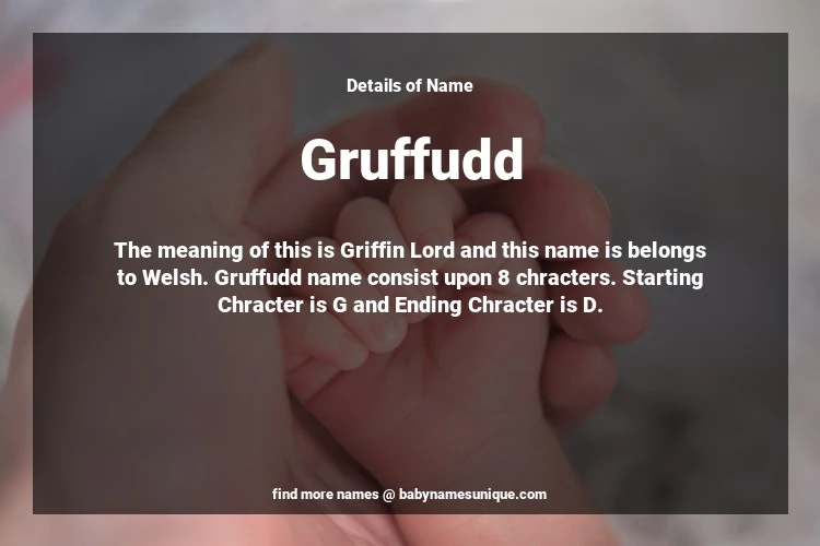 The name Gruffudd is chosen by those who are willing to find Unique Boy Baby Names. The meaning of this is Griffin Lord and this name is belongs to Welsh Origin. Baby Name Gruffudd consist upon 8 chracters. Starting alphabet is G and ending alphabet is D. This name is used primarily by parents who are considering unique baby names for Boy. The Zodiac Sign suitbale for this name are;