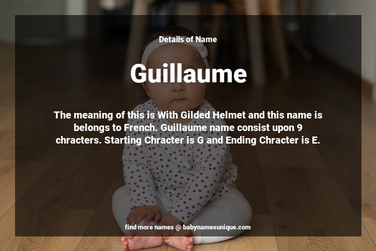The name Guillaume is chosen by those who are willing to find Unique Boy Baby Names. The meaning of this is With Gilded Helmet and this name is belongs to French Origin. Baby Name Guillaume consist upon 9 chracters. Starting alphabet is G and ending alphabet is E. This name is used primarily by parents who are considering unique baby names for Boy. The Zodiac Sign suitbale for this name are;