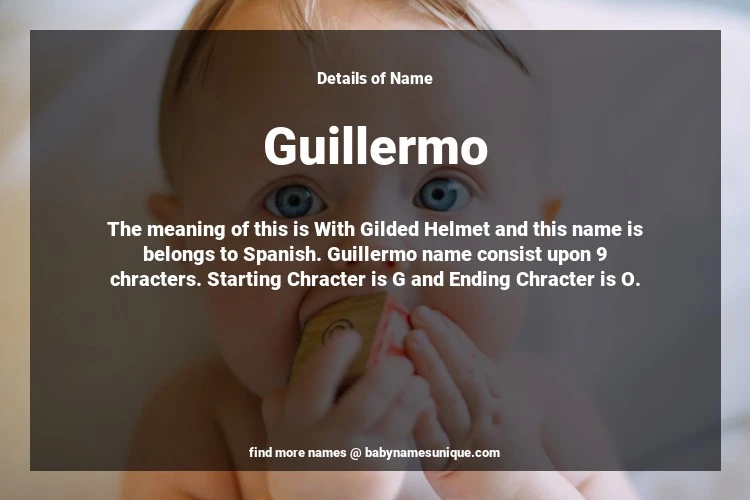 The name Guillermo is chosen by those who are willing to find Unique Boy Baby Names. The meaning of this is With Gilded Helmet and this name is belongs to Spanish Origin. Baby Name Guillermo consist upon 9 chracters. Starting alphabet is G and ending alphabet is O. This name is used primarily by parents who are considering unique baby names for Boy. The Zodiac Sign suitbale for this name are;