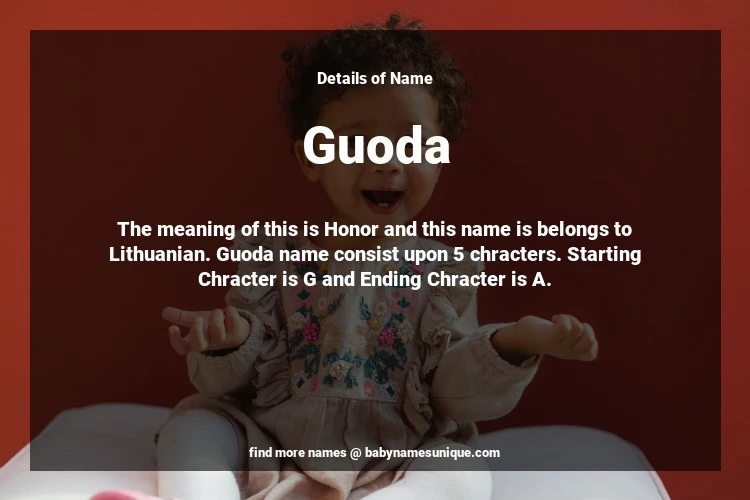 The name Guoda is chosen by those who are willing to find Unique Transgenders Baby Names. The meaning of this is Honor and this name is belongs to Lithuanian Origin. Baby Name Guoda consist upon 5 chracters. Starting alphabet is G and ending alphabet is A. This name is used primarily by parents who are considering unique baby names for Transgenders. The Zodiac Sign suitbale for this name are;