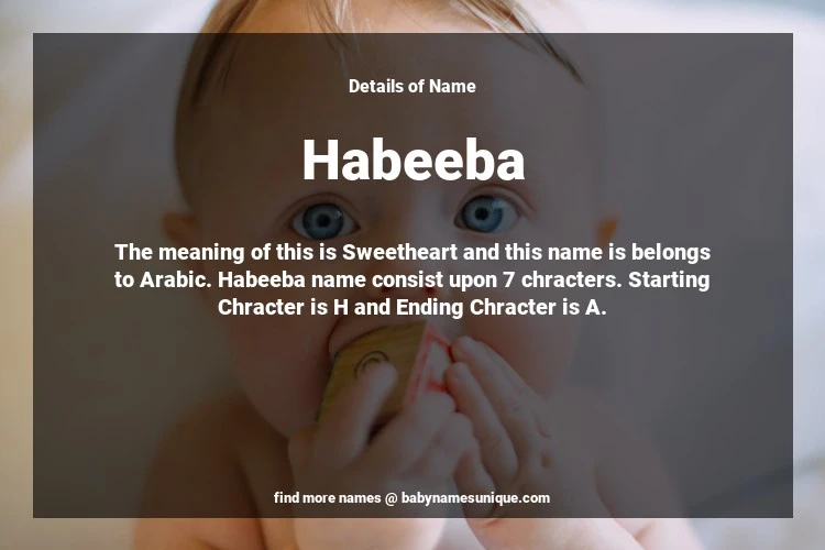 The name Habeeba is chosen by those who are willing to find Unique Transgenders Baby Names. The meaning of this is Sweetheart and this name is belongs to Arabic Origin. Baby Name Habeeba consist upon 7 chracters. Starting alphabet is H and ending alphabet is A. This name is used primarily by parents who are considering unique baby names for Transgenders. The Zodiac Sign suitbale for this name are;
