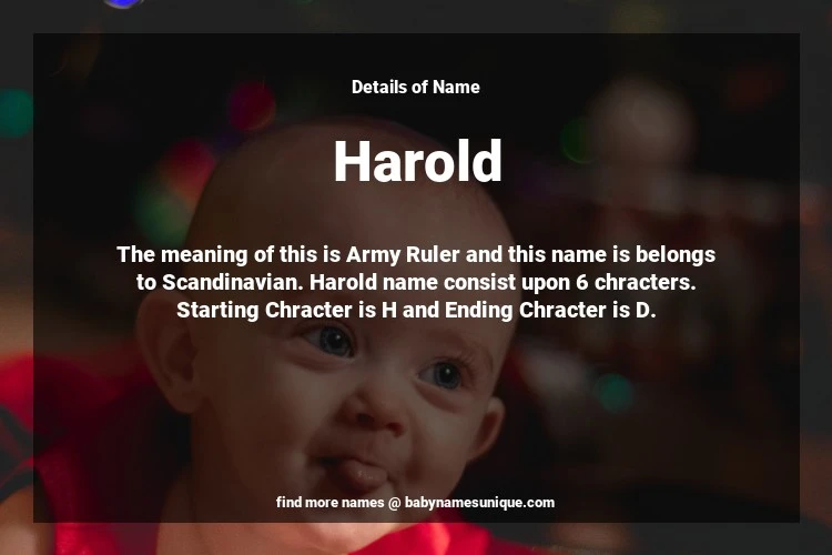 The name Harold is chosen by those who are willing to find Unique Boy Baby Names. The meaning of this is Army Ruler and this name is belongs to Scandinavian Origin. Baby Name Harold consist upon 6 chracters. Starting alphabet is H and ending alphabet is D. This name is used primarily by parents who are considering unique baby names for Boy. The Zodiac Sign suitbale for this name are;