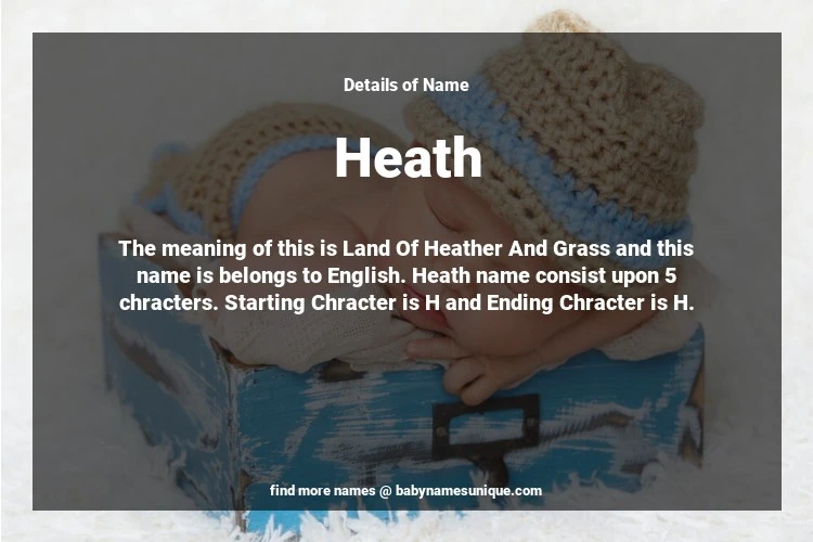 The name Heath is chosen by those who are willing to find Unique Boy Baby Names. The meaning of this is Land Of Heather And Grass and this name is belongs to English Origin. Baby Name Heath consist upon 5 chracters. Starting alphabet is H and ending alphabet is H. This name is used primarily by parents who are considering unique baby names for Boy. The Zodiac Sign suitbale for this name are;