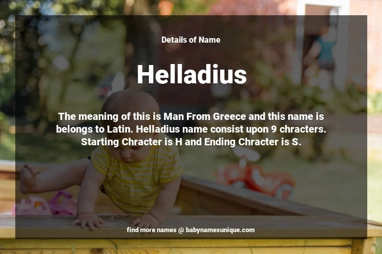 The name Helladius is chosen by those who are willing to find Unique Boy Baby Names. The meaning of this is Man From Greece and this name is belongs to Latin Origin. Baby Name Helladius consist upon 9 chracters. Starting alphabet is H and ending alphabet is S. This name is used primarily by parents who are considering unique baby names for Boy. The Zodiac Sign suitbale for this name are;