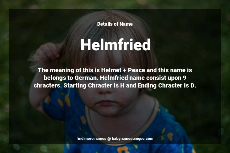 The name Helmfried is chosen by those who are willing to find Unique Boy Baby Names. The meaning of this is Helmet + Peace and this name is belongs to German Origin. Baby Name Helmfried consist upon 9 chracters. Starting alphabet is H and ending alphabet is D. This name is used primarily by parents who are considering unique baby names for Boy. The Zodiac Sign suitbale for this name are;
