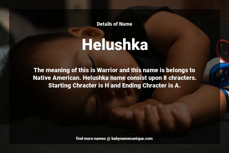 The name Helushka is chosen by those who are willing to find Unique Boy Baby Names. The meaning of this is Warrior and this name is belongs to Native American Origin. Baby Name Helushka consist upon 8 chracters. Starting alphabet is H and ending alphabet is A. This name is used primarily by parents who are considering unique baby names for Boy. The Zodiac Sign suitbale for this name are;
