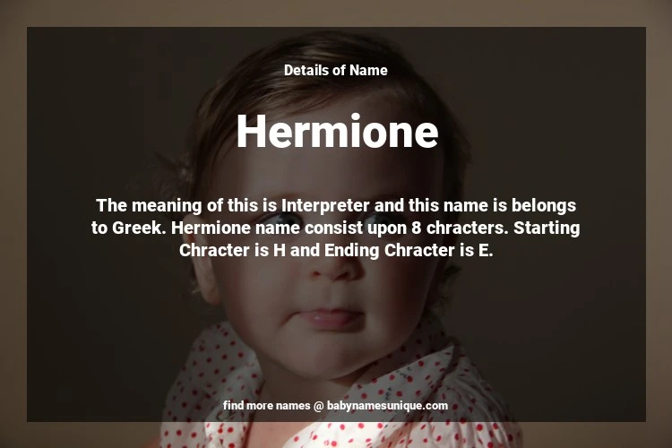 The name Hermione is chosen by those who are willing to find Unique Transgenders Baby Names. The meaning of this is Interpreter and this name is belongs to Greek Origin. Baby Name Hermione consist upon 8 chracters. Starting alphabet is H and ending alphabet is E. This name is used primarily by parents who are considering unique baby names for Transgenders. The Zodiac Sign suitbale for this name are;