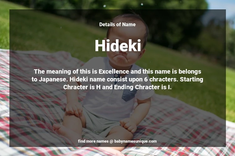 The name Hideki is chosen by those who are willing to find Unique Boy Baby Names. The meaning of this is Excellence and this name is belongs to Japanese Origin. Baby Name Hideki consist upon 6 chracters. Starting alphabet is H and ending alphabet is I. This name is used primarily by parents who are considering unique baby names for Boy. The Zodiac Sign suitbale for this name are;