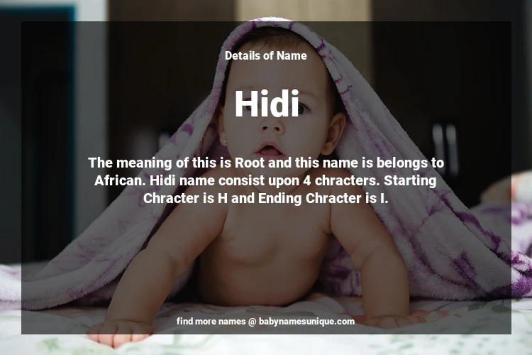 The name Hidi is chosen by those who are willing to find Unique Transgenders Baby Names. The meaning of this is Root and this name is belongs to African Origin. Baby Name Hidi consist upon 4 chracters. Starting alphabet is H and ending alphabet is I. This name is used primarily by parents who are considering unique baby names for Transgenders. The Zodiac Sign suitbale for this name are;