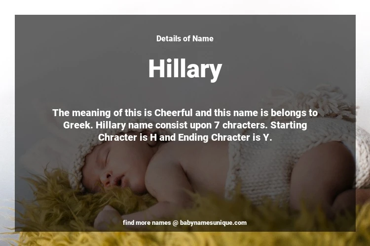 The name Hillary is chosen by those who are willing to find Unique Transgenders Baby Names. The meaning of this is Cheerful and this name is belongs to Greek Origin. Baby Name Hillary consist upon 7 chracters. Starting alphabet is H and ending alphabet is Y. This name is used primarily by parents who are considering unique baby names for Transgenders. The Zodiac Sign suitbale for this name are;