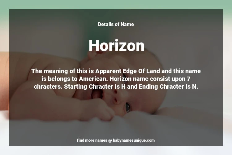 The name Horizon is chosen by those who are willing to find Unique Transgenders Baby Names. The meaning of this is Apparent Edge Of Land and this name is belongs to American Origin. Baby Name Horizon consist upon 7 chracters. Starting alphabet is H and ending alphabet is N. This name is used primarily by parents who are considering unique baby names for Transgenders. The Zodiac Sign suitbale for this name are;