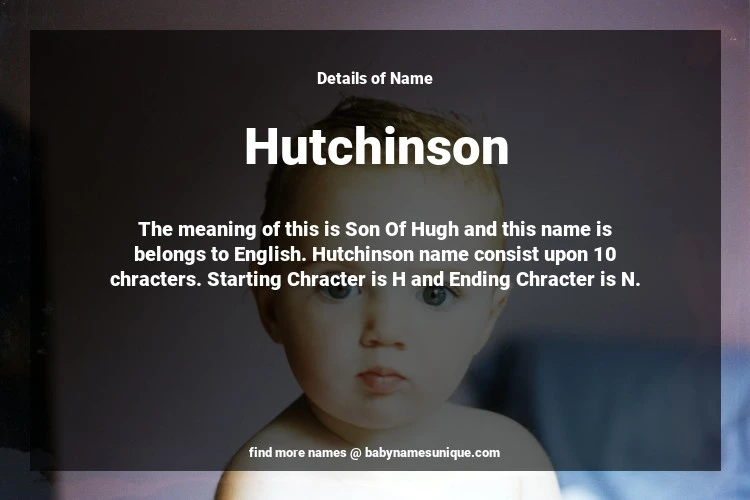 The name Hutchinson is chosen by those who are willing to find Unique Transgenders Baby Names. The meaning of this is Son Of Hugh and this name is belongs to English Origin. Baby Name Hutchinson consist upon 10 chracters. Starting alphabet is H and ending alphabet is N. This name is used primarily by parents who are considering unique baby names for Transgenders. The Zodiac Sign suitbale for this name are;