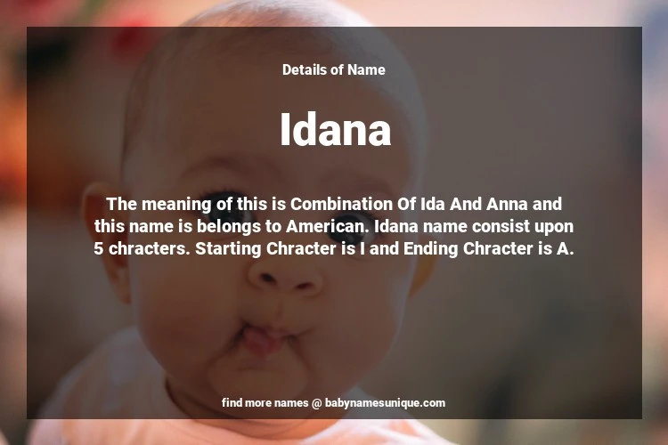 The name Idana is chosen by those who are willing to find Unique Transgenders Baby Names. The meaning of this is Combination Of Ida And Anna and this name is belongs to American Origin. Baby Name Idana consist upon 5 chracters. Starting alphabet is I and ending alphabet is A. This name is used primarily by parents who are considering unique baby names for Transgenders. The Zodiac Sign suitbale for this name are;