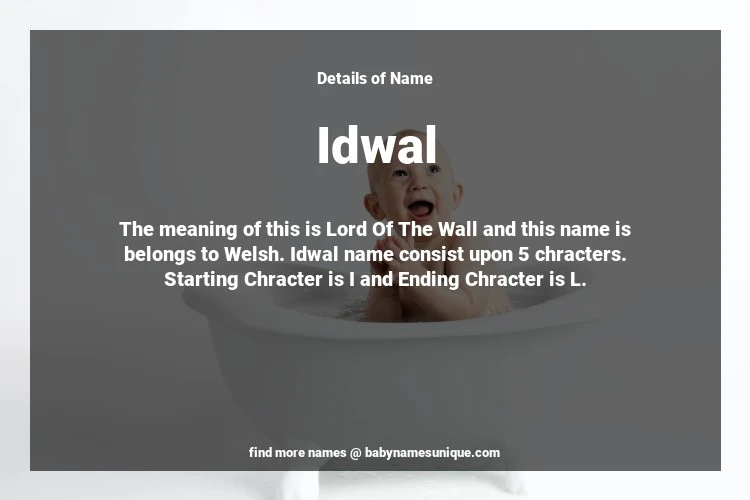 The name Idwal is chosen by those who are willing to find Unique Boy Baby Names. The meaning of this is Lord Of The Wall and this name is belongs to Welsh Origin. Baby Name Idwal consist upon 5 chracters. Starting alphabet is I and ending alphabet is L. This name is used primarily by parents who are considering unique baby names for Boy. The Zodiac Sign suitbale for this name are;