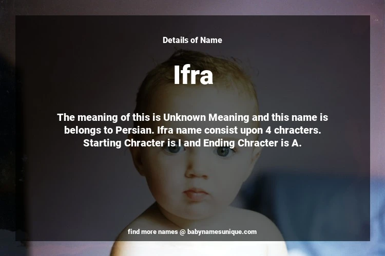 The name Ifra is chosen by those who are willing to find Unique Transgenders Baby Names. The meaning of this is Unknown Meaning and this name is belongs to Persian Origin. Baby Name Ifra consist upon 4 chracters. Starting alphabet is I and ending alphabet is A. This name is used primarily by parents who are considering unique baby names for Transgenders. The Zodiac Sign suitbale for this name are;