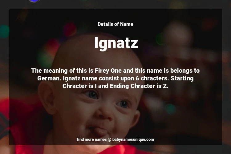 The name Ignatz is chosen by those who are willing to find Unique Boy Baby Names. The meaning of this is Firey One and this name is belongs to German Origin. Baby Name Ignatz consist upon 6 chracters. Starting alphabet is I and ending alphabet is Z. This name is used primarily by parents who are considering unique baby names for Boy. The Zodiac Sign suitbale for this name are;
