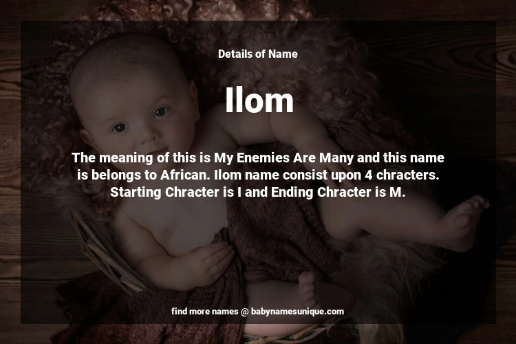 The name Ilom is chosen by those who are willing to find Unique Boy Baby Names. The meaning of this is My Enemies Are Many and this name is belongs to African Origin. Baby Name Ilom consist upon 4 chracters. Starting alphabet is I and ending alphabet is M. This name is used primarily by parents who are considering unique baby names for Boy. The Zodiac Sign suitbale for this name are;
