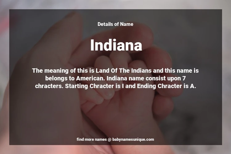 The name Indiana is chosen by those who are willing to find Unique Transgenders Baby Names. The meaning of this is Land Of The Indians and this name is belongs to American Origin. Baby Name Indiana consist upon 7 chracters. Starting alphabet is I and ending alphabet is A. This name is used primarily by parents who are considering unique baby names for Transgenders. The Zodiac Sign suitbale for this name are;