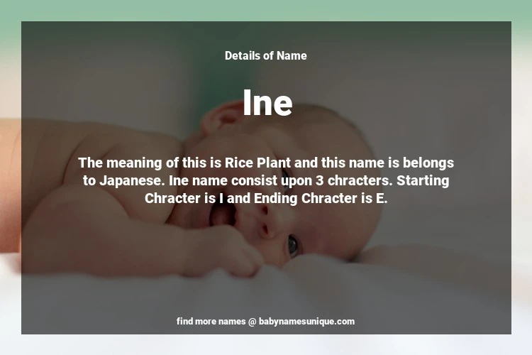 The name Ine is chosen by those who are willing to find Unique Transgenders Baby Names. The meaning of this is Rice Plant and this name is belongs to Japanese Origin. Baby Name Ine consist upon 3 chracters. Starting alphabet is I and ending alphabet is E. This name is used primarily by parents who are considering unique baby names for Transgenders. The Zodiac Sign suitbale for this name are;
