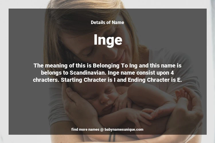 The name Inge is chosen by those who are willing to find Unique Transgenders Baby Names. The meaning of this is Belonging To Ing and this name is belongs to Scandinavian Origin. Baby Name Inge consist upon 4 chracters. Starting alphabet is I and ending alphabet is E. This name is used primarily by parents who are considering unique baby names for Transgenders. The Zodiac Sign suitbale for this name are;