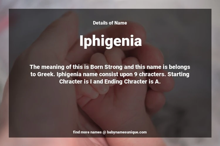 The name Iphigenia is chosen by those who are willing to find Unique Transgenders Baby Names. The meaning of this is Born Strong and this name is belongs to Greek Origin. Baby Name Iphigenia consist upon 9 chracters. Starting alphabet is I and ending alphabet is A. This name is used primarily by parents who are considering unique baby names for Transgenders. The Zodiac Sign suitbale for this name are;