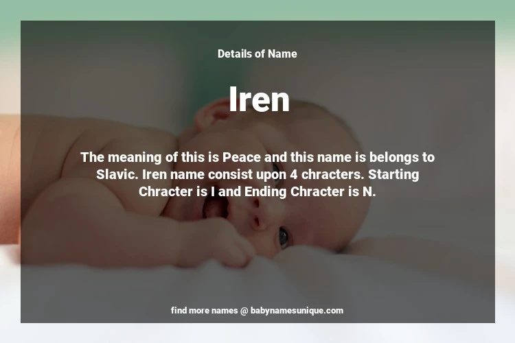 The name Iren is chosen by those who are willing to find Unique Transgenders Baby Names. The meaning of this is Peace and this name is belongs to Slavic Origin. Baby Name Iren consist upon 4 chracters. Starting alphabet is I and ending alphabet is N. This name is used primarily by parents who are considering unique baby names for Transgenders. The Zodiac Sign suitbale for this name are;