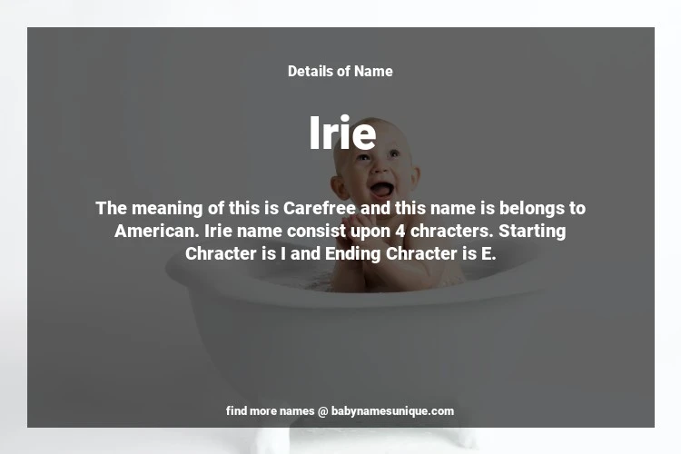 The name Irie is chosen by those who are willing to find Unique Transgenders Baby Names. The meaning of this is Carefree and this name is belongs to American Origin. Baby Name Irie consist upon 4 chracters. Starting alphabet is I and ending alphabet is E. This name is used primarily by parents who are considering unique baby names for Transgenders. The Zodiac Sign suitbale for this name are;
