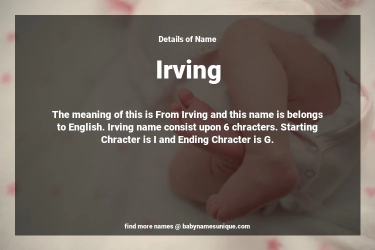 The name Irving is chosen by those who are willing to find Unique Boy Baby Names. The meaning of this is From Irving and this name is belongs to English Origin. Baby Name Irving consist upon 6 chracters. Starting alphabet is I and ending alphabet is G. This name is used primarily by parents who are considering unique baby names for Boy. The Zodiac Sign suitbale for this name are;