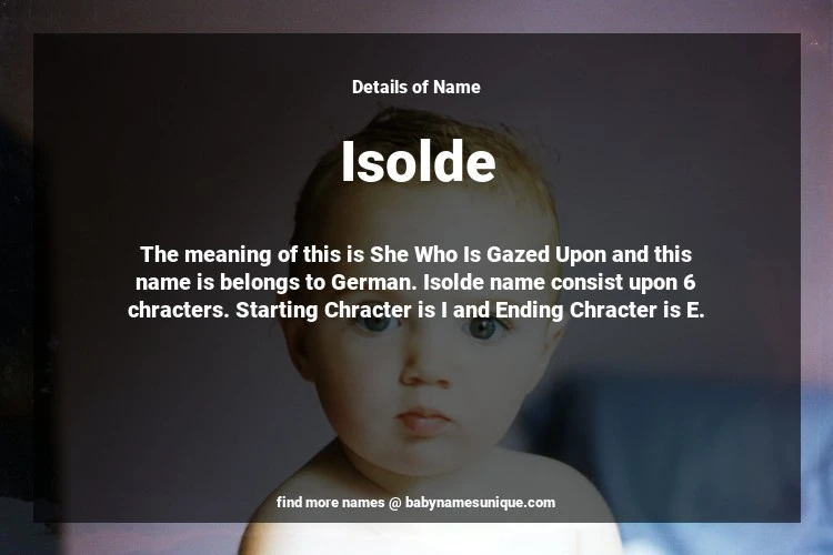 The name Isolde is chosen by those who are willing to find Unique Transgenders Baby Names. The meaning of this is She Who Is Gazed Upon and this name is belongs to German Origin. Baby Name Isolde consist upon 6 chracters. Starting alphabet is I and ending alphabet is E. This name is used primarily by parents who are considering unique baby names for Transgenders. The Zodiac Sign suitbale for this name are;