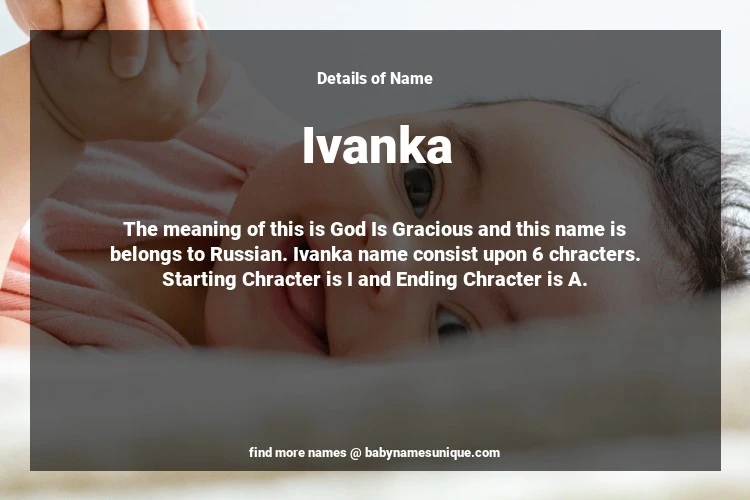 The name Ivanka is chosen by those who are willing to find Unique Transgenders Baby Names. The meaning of this is God Is Gracious and this name is belongs to Russian Origin. Baby Name Ivanka consist upon 6 chracters. Starting alphabet is I and ending alphabet is A. This name is used primarily by parents who are considering unique baby names for Transgenders. The Zodiac Sign suitbale for this name are;