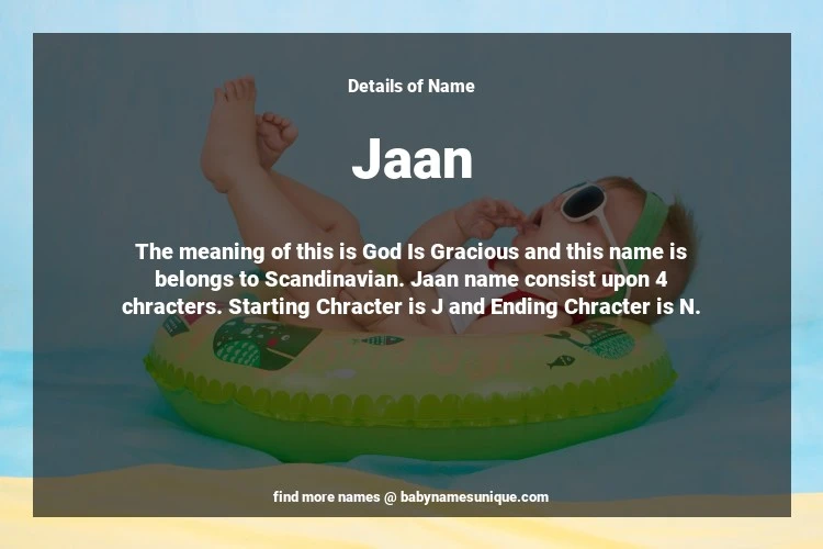 The name Jaan is chosen by those who are willing to find Unique Boy Baby Names. The meaning of this is God Is Gracious and this name is belongs to Scandinavian Origin. Baby Name Jaan consist upon 4 chracters. Starting alphabet is J and ending alphabet is N. This name is used primarily by parents who are considering unique baby names for Boy. The Zodiac Sign suitbale for this name are;