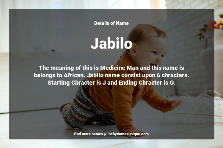 The name Jabilo is chosen by those who are willing to find Unique Boy Baby Names. The meaning of this is Medicine Man and this name is belongs to African Origin. Baby Name Jabilo consist upon 6 chracters. Starting alphabet is J and ending alphabet is O. This name is used primarily by parents who are considering unique baby names for Boy. The Zodiac Sign suitbale for this name are;