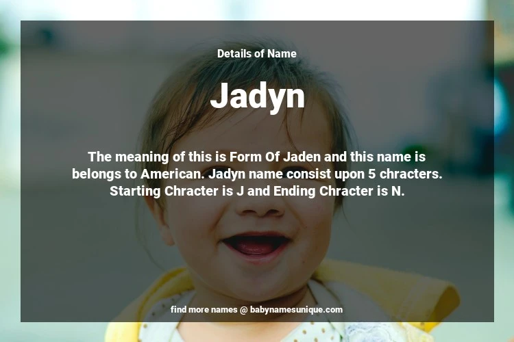 The name Jadyn is chosen by those who are willing to find Unique Transgenders Baby Names. The meaning of this is Form Of Jaden and this name is belongs to American Origin. Baby Name Jadyn consist upon 5 chracters. Starting alphabet is J and ending alphabet is N. This name is used primarily by parents who are considering unique baby names for Transgenders. The Zodiac Sign suitbale for this name are;