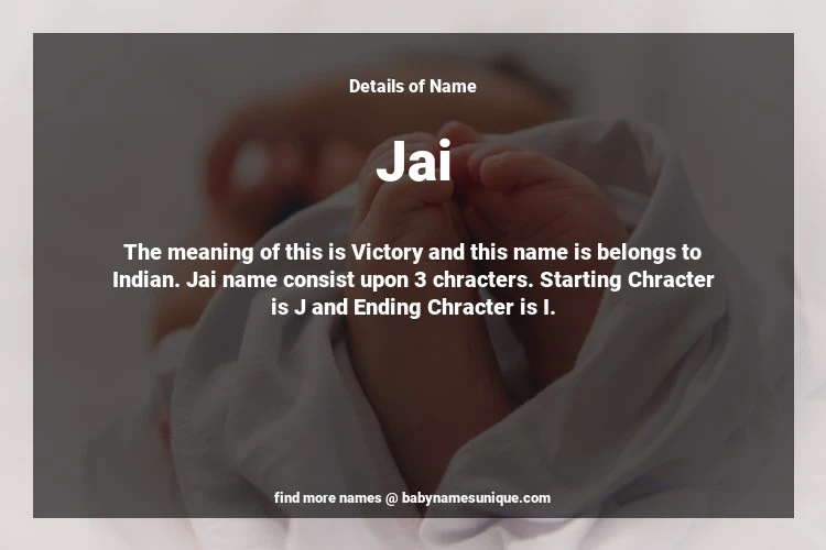 The name Jai is chosen by those who are willing to find Unique Boy Baby Names. The meaning of this is Victory and this name is belongs to Indian Origin. Baby Name Jai consist upon 3 chracters. Starting alphabet is J and ending alphabet is I. This name is used primarily by parents who are considering unique baby names for Boy. The Zodiac Sign suitbale for this name are;