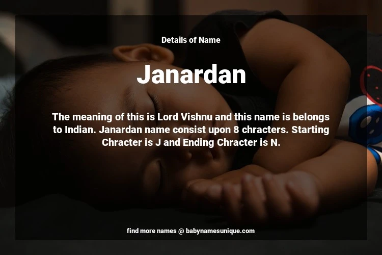 The name Janardan is chosen by those who are willing to find Unique Boy Baby Names. The meaning of this is Lord Vishnu and this name is belongs to Indian Origin. Baby Name Janardan consist upon 8 chracters. Starting alphabet is J and ending alphabet is N. This name is used primarily by parents who are considering unique baby names for Boy. The Zodiac Sign suitbale for this name are;
