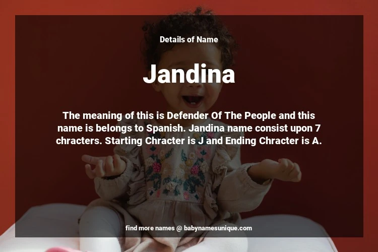 The name Jandina is chosen by those who are willing to find Unique Transgenders Baby Names. The meaning of this is Defender Of The People and this name is belongs to Spanish Origin. Baby Name Jandina consist upon 7 chracters. Starting alphabet is J and ending alphabet is A. This name is used primarily by parents who are considering unique baby names for Transgenders. The Zodiac Sign suitbale for this name are;