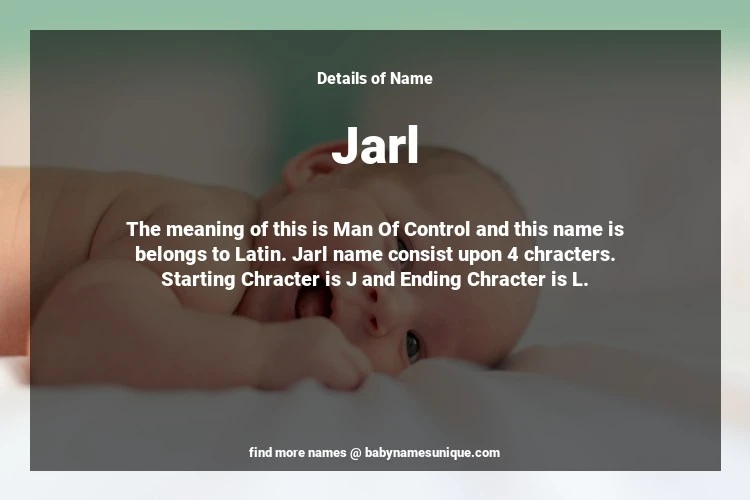 The name Jarl is chosen by those who are willing to find Unique Boy Baby Names. The meaning of this is Man Of Control and this name is belongs to Latin Origin. Baby Name Jarl consist upon 4 chracters. Starting alphabet is J and ending alphabet is L. This name is used primarily by parents who are considering unique baby names for Boy. The Zodiac Sign suitbale for this name are;