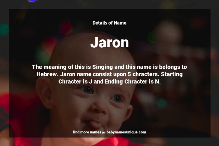 The name Jaron is chosen by those who are willing to find Unique Boy Baby Names. The meaning of this is Singing and this name is belongs to Hebrew Origin. Baby Name Jaron consist upon 5 chracters. Starting alphabet is J and ending alphabet is N. This name is used primarily by parents who are considering unique baby names for Boy. The Zodiac Sign suitbale for this name are;