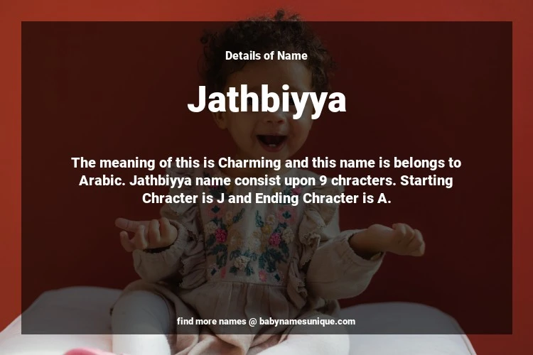 The name Jathbiyya is chosen by those who are willing to find Unique Transgenders Baby Names. The meaning of this is Charming and this name is belongs to Arabic Origin. Baby Name Jathbiyya consist upon 9 chracters. Starting alphabet is J and ending alphabet is A. This name is used primarily by parents who are considering unique baby names for Transgenders. The Zodiac Sign suitbale for this name are;