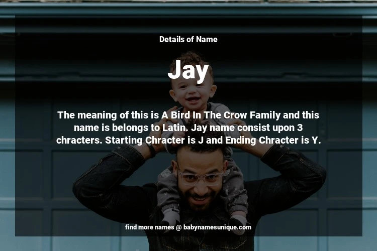 The name Jay is chosen by those who are willing to find Unique Boy Baby Names. The meaning of this is A Bird In The Crow Family and this name is belongs to Latin Origin. Baby Name Jay consist upon 3 chracters. Starting alphabet is J and ending alphabet is Y. This name is used primarily by parents who are considering unique baby names for Boy. The Zodiac Sign suitbale for this name are;