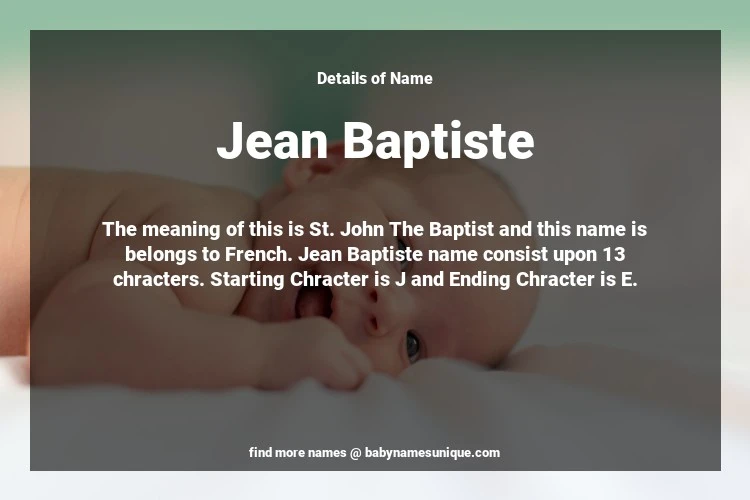 The name Jean Baptiste is chosen by those who are willing to find Unique Boy Baby Names. The meaning of this is St. John The Baptist and this name is belongs to French Origin. Baby Name Jean Baptiste consist upon 13 chracters. Starting alphabet is J and ending alphabet is E. This name is used primarily by parents who are considering unique baby names for Boy. The Zodiac Sign suitbale for this name are;