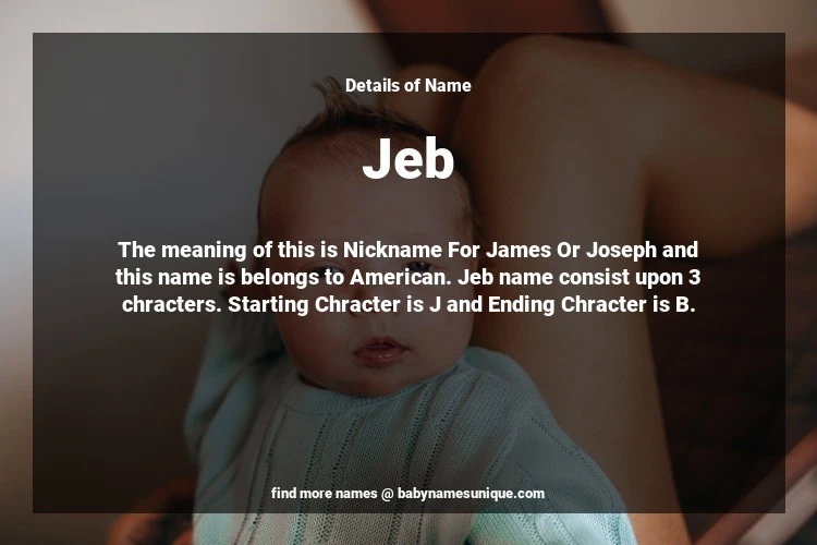 The name Jeb is chosen by those who are willing to find Unique Boy Baby Names. The meaning of this is Nickname For James Or Joseph and this name is belongs to American Origin. Baby Name Jeb consist upon 3 chracters. Starting alphabet is J and ending alphabet is B. This name is used primarily by parents who are considering unique baby names for Boy. The Zodiac Sign suitbale for this name are;