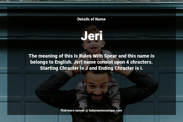The name Jeri is chosen by those who are willing to find Unique Transgenders Baby Names. The meaning of this is Rules With Spear and this name is belongs to English Origin. Baby Name Jeri consist upon 4 chracters. Starting alphabet is J and ending alphabet is I. This name is used primarily by parents who are considering unique baby names for Transgenders. The Zodiac Sign suitbale for this name are;