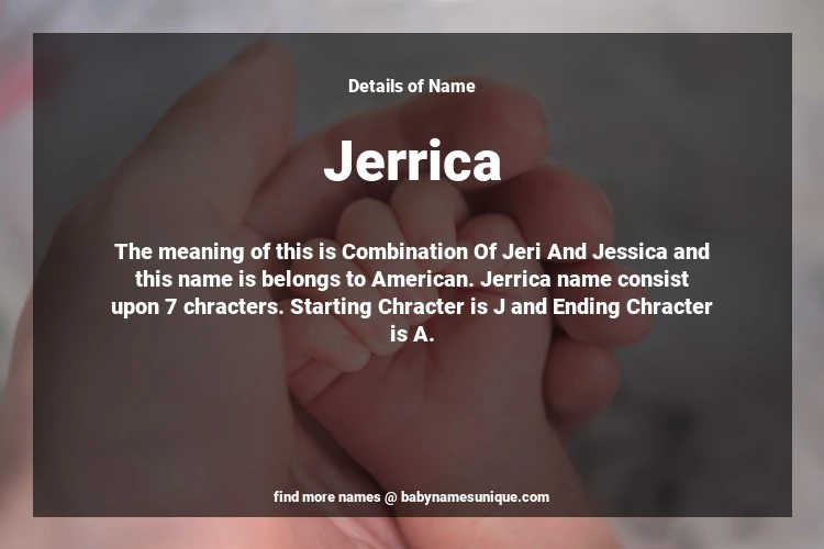 The name Jerrica is chosen by those who are willing to find Unique Transgenders Baby Names. The meaning of this is Combination Of Jeri And Jessica and this name is belongs to American Origin. Baby Name Jerrica consist upon 7 chracters. Starting alphabet is J and ending alphabet is A. This name is used primarily by parents who are considering unique baby names for Transgenders. The Zodiac Sign suitbale for this name are;