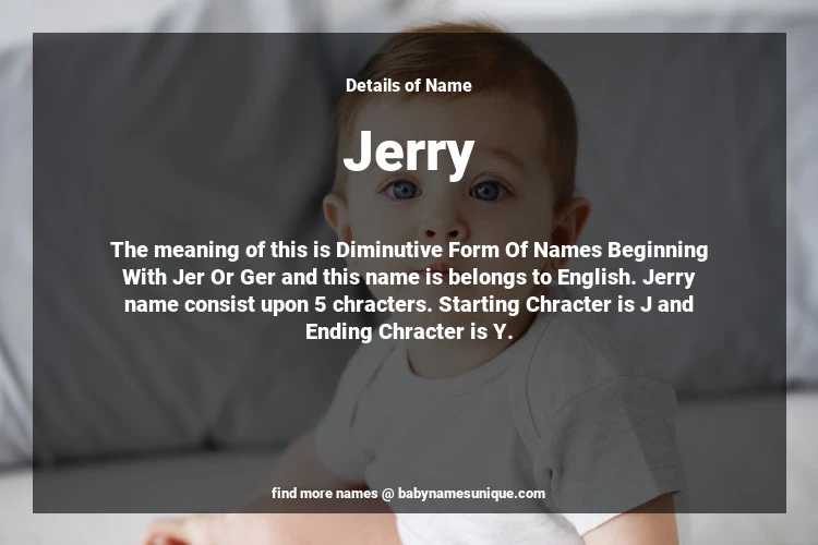 The name Jerry is chosen by those who are willing to find Unique Transgenders Baby Names. The meaning of this is Diminutive Form Of Names Beginning With Jer Or Ger and this name is belongs to English Origin. Baby Name Jerry consist upon 5 chracters. Starting alphabet is J and ending alphabet is Y. This name is used primarily by parents who are considering unique baby names for Transgenders. The Zodiac Sign suitbale for this name are;