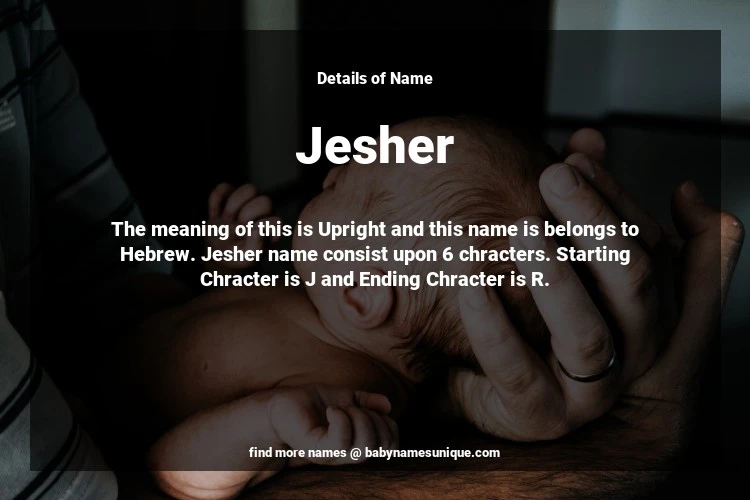 The name Jesher is chosen by those who are willing to find Unique Boy Baby Names. The meaning of this is Upright and this name is belongs to Hebrew Origin. Baby Name Jesher consist upon 6 chracters. Starting alphabet is J and ending alphabet is R. This name is used primarily by parents who are considering unique baby names for Boy. The Zodiac Sign suitbale for this name are;
