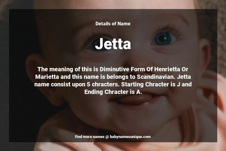 The name Jetta is chosen by those who are willing to find Unique Transgenders Baby Names. The meaning of this is Diminutive Form Of Henrietta Or Marietta and this name is belongs to Scandinavian Origin. Baby Name Jetta consist upon 5 chracters. Starting alphabet is J and ending alphabet is A. This name is used primarily by parents who are considering unique baby names for Transgenders. The Zodiac Sign suitbale for this name are;