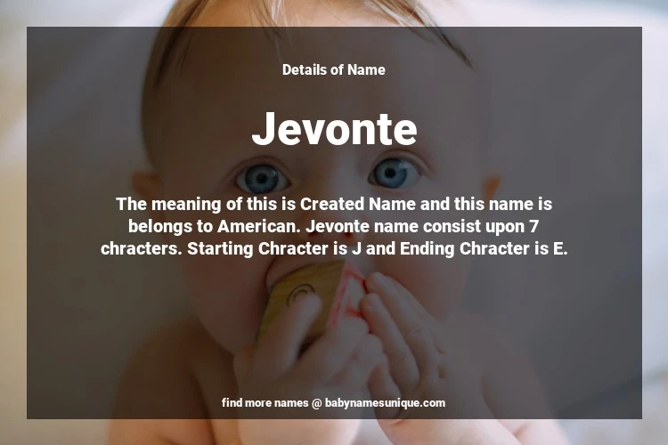 The name Jevonte is chosen by those who are willing to find Unique Boy Baby Names. The meaning of this is Created Name and this name is belongs to American Origin. Baby Name Jevonte consist upon 7 chracters. Starting alphabet is J and ending alphabet is E. This name is used primarily by parents who are considering unique baby names for Boy. The Zodiac Sign suitbale for this name are;